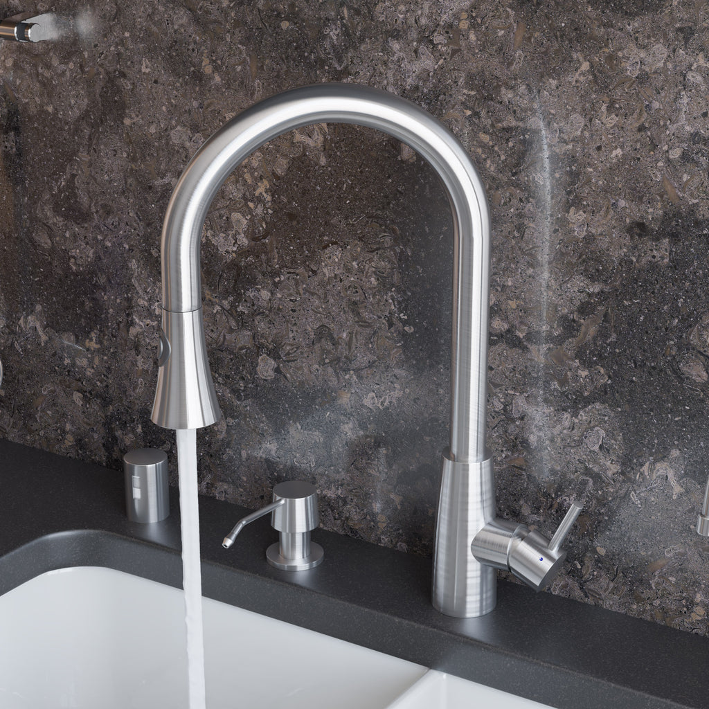 LEON kitchen faucets by ALFI brand are made of solid stainless steel. This is unlike traditional faucets which are primarily made out of brass and treated to create different finishes. These faucets are built tough and made to last for decades. Both durable and aesthetically pleasing, they are sure to satisfy your kitchen needs.