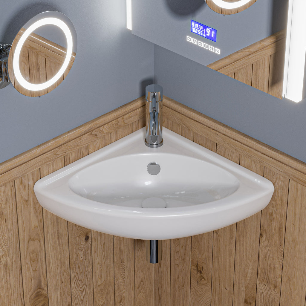 A simple small porcelain wall mounted bathroom sink is sometimes harder to find than you might think. This ALFI brand corner sink offers a modern sink design in a compact size and convenient shape. Perfect for upgrading small bathrooms or powder rooms.
