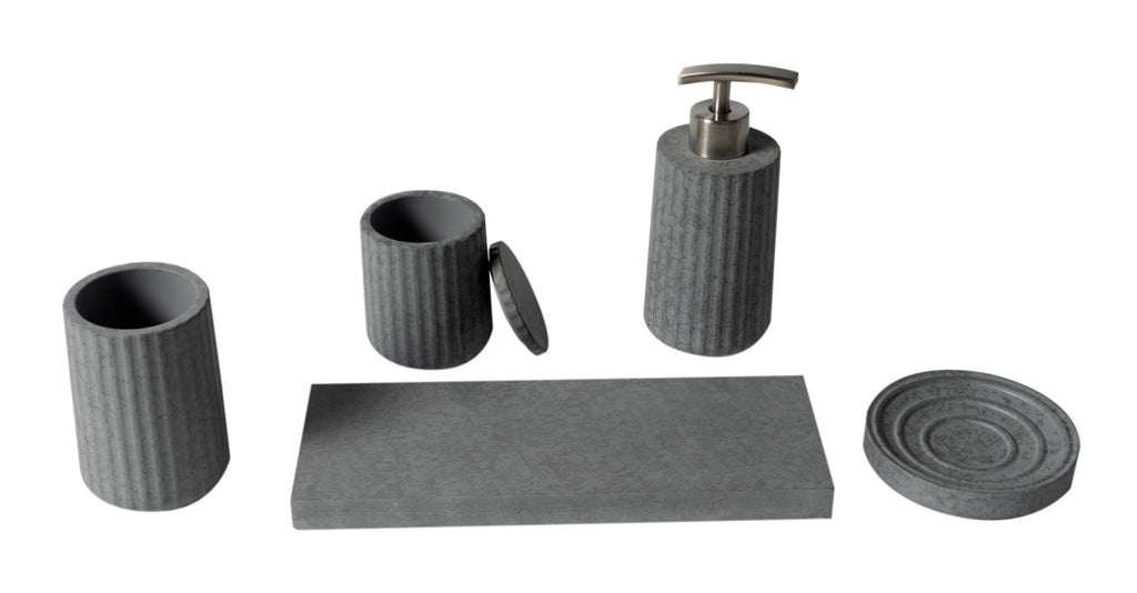 - 5 Piece Set Includes: soap dish, liquid soap dispenser, small concrete tray, cup with lid, toothbrush cup.