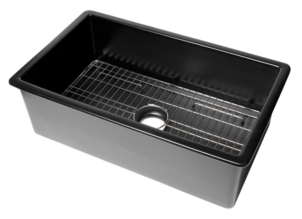 Black Matte 32" x 19" Fireclay Single Bowl Undermount / Drop In Kitchen Sink w Grid