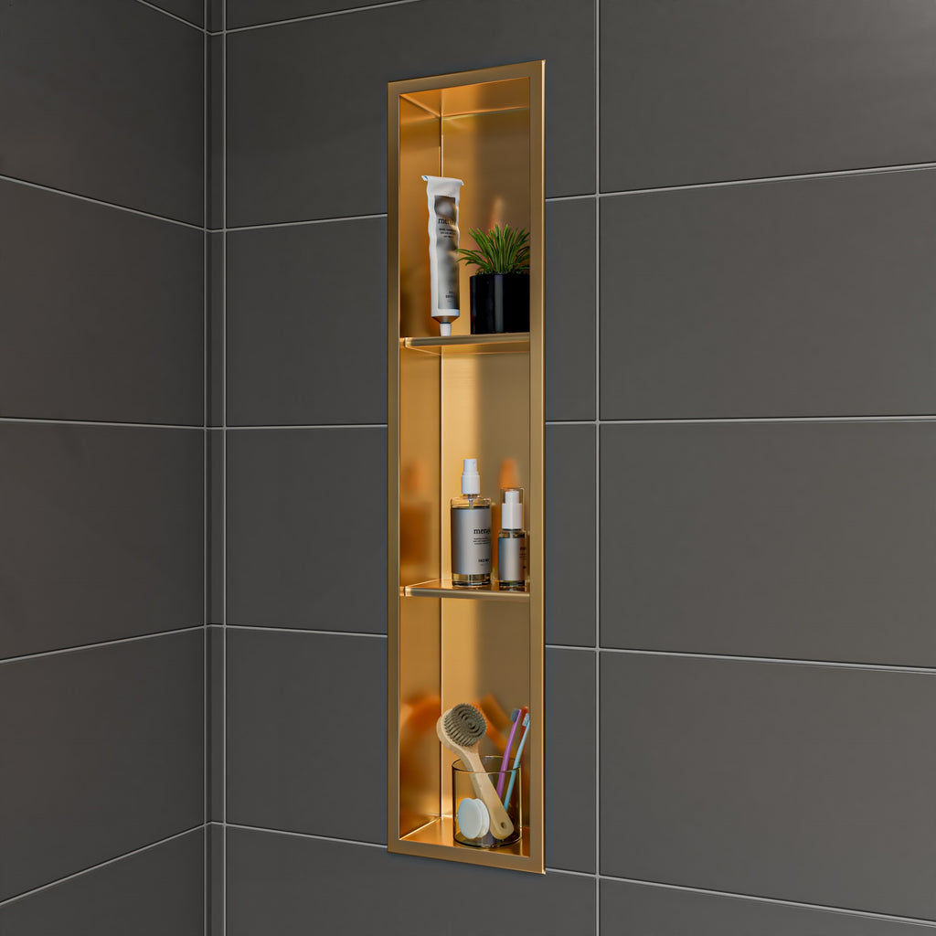 - Not just for your shower! This recessed niche adds convenient space to use for storage, decor or more. The gold color makes this niche the perfect modern choice for easy to install recessed shelving anywhere. The gold color makes a statement and can become a centerpiece that matches effortlessly with other gold hardware.