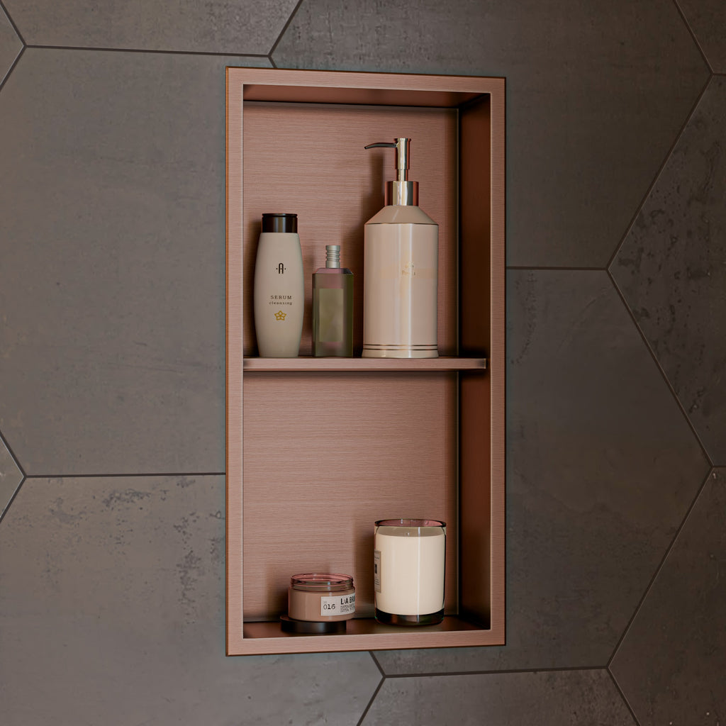 - Not just for your shower! This recessed niche adds convenient space to use for storage, decor or more. The copper color makes this niche the perfect modern choice for easy to install recessed shelving anywhere. The copper color makes a statement and can become a centerpiece that matches effortlessly with other copper hardware.