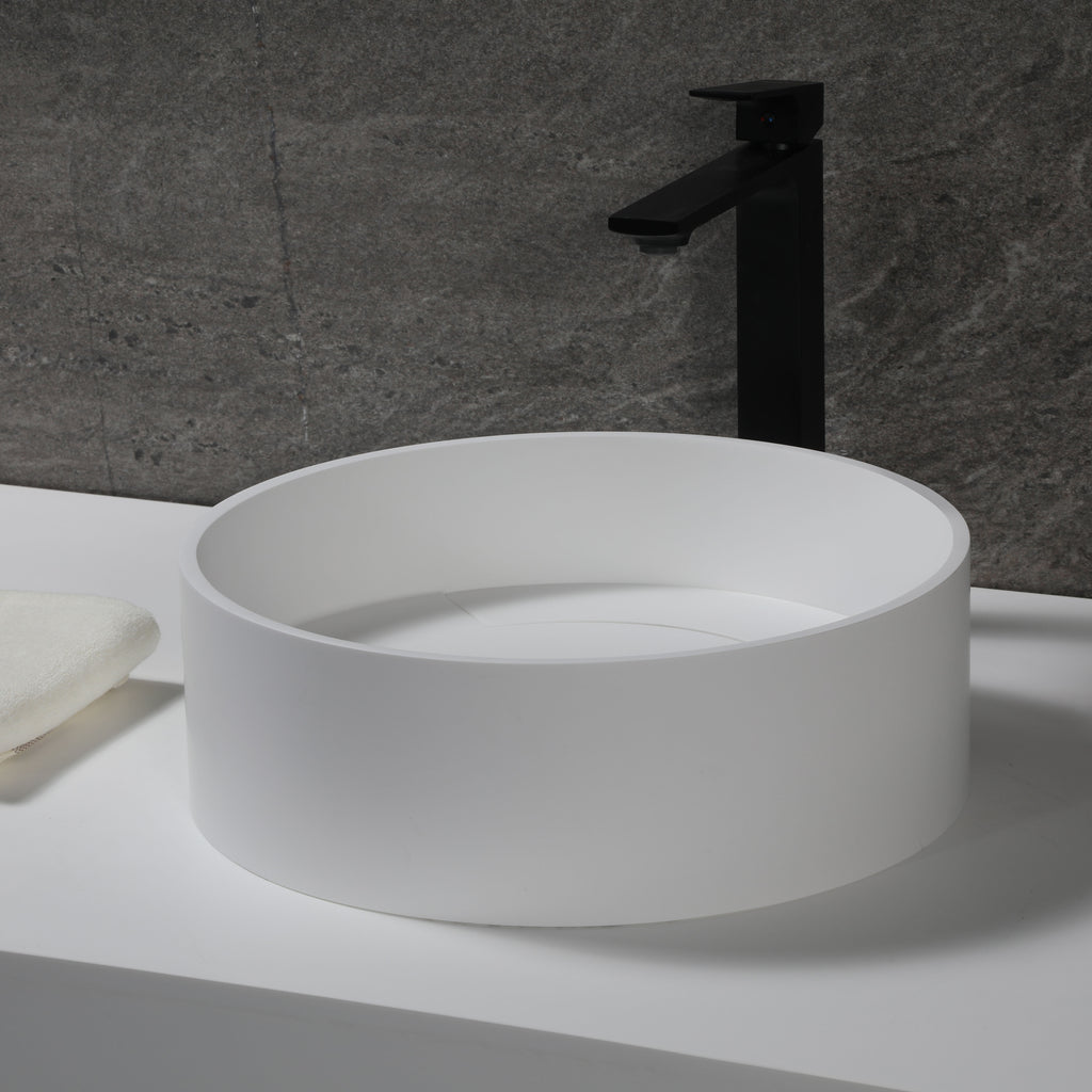 Upgrade your bathroom with this sleek modern round sink made of solid surface composite. It's coolest feature is that the drain is completely concealed. It's designed with a contemoprary flair in mind featuring it's sharp corner radius and edges.