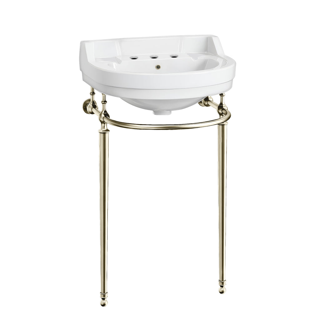 22" Console Sink With Semi-Circular Bowl, Single Faucet Drilling, Solid Brass Leg Supports, Backsplash, Overflow and Front Towel Bar.